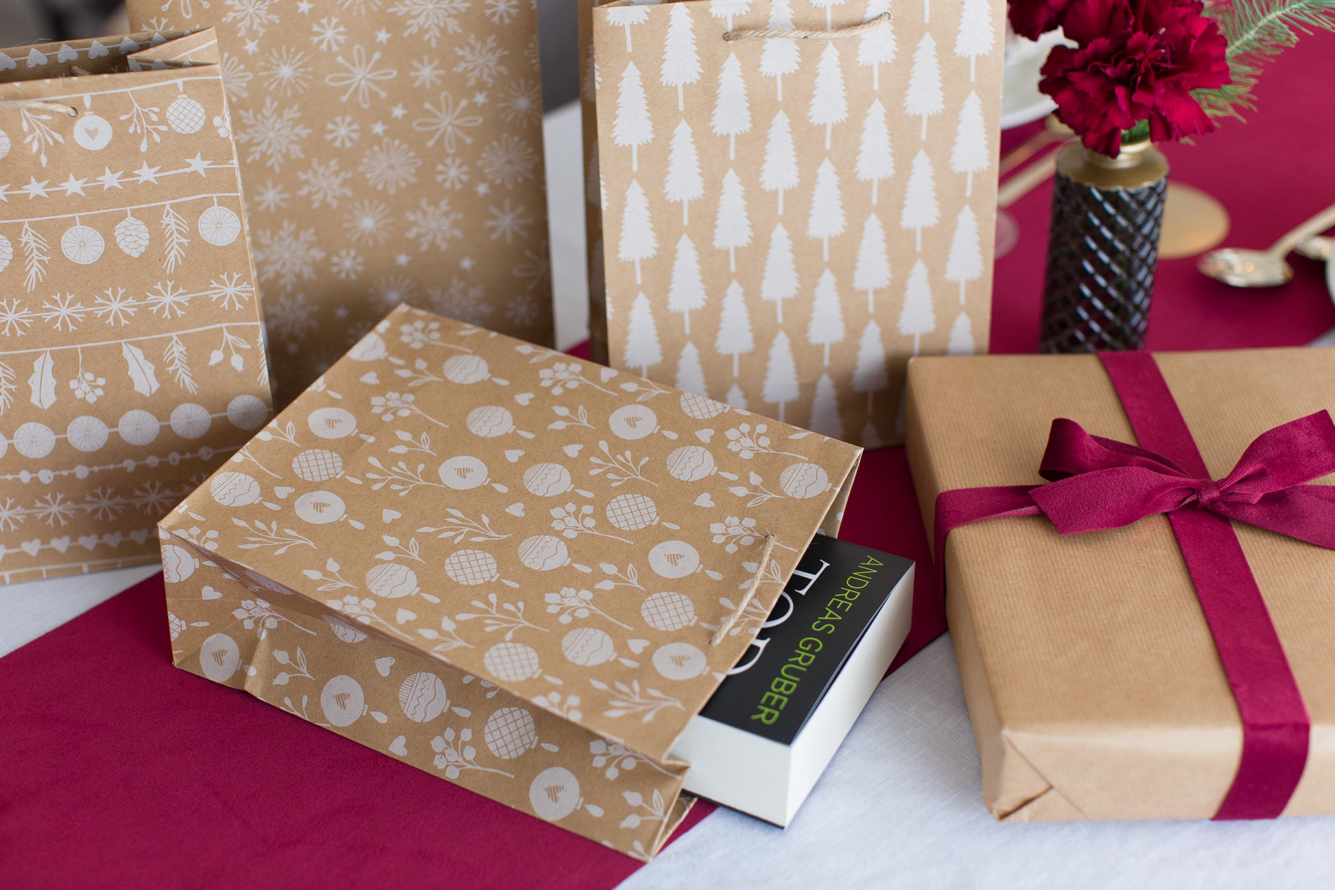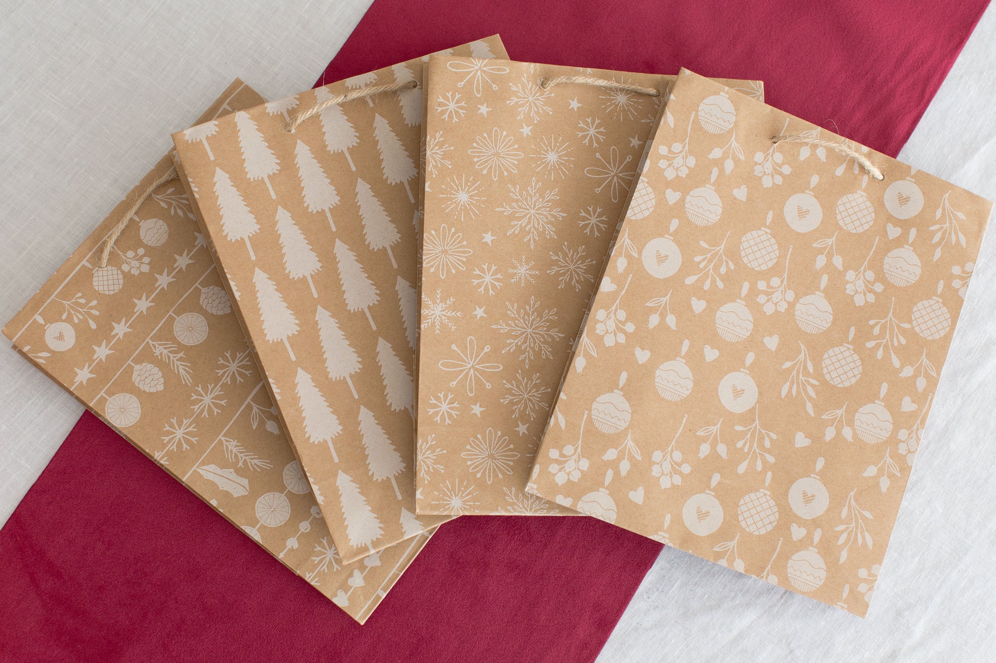 Tolle Geschenktaschen für kleine und mittelgroße Weihnachtsüberraschungen! Die Geschenktüten aus Kraftpapier sind in weiß mit zauberhaften skandinavischen Mustern bedruckt. Gehalten werden die Kraftpapiertüten mit Griffen aus Jute.