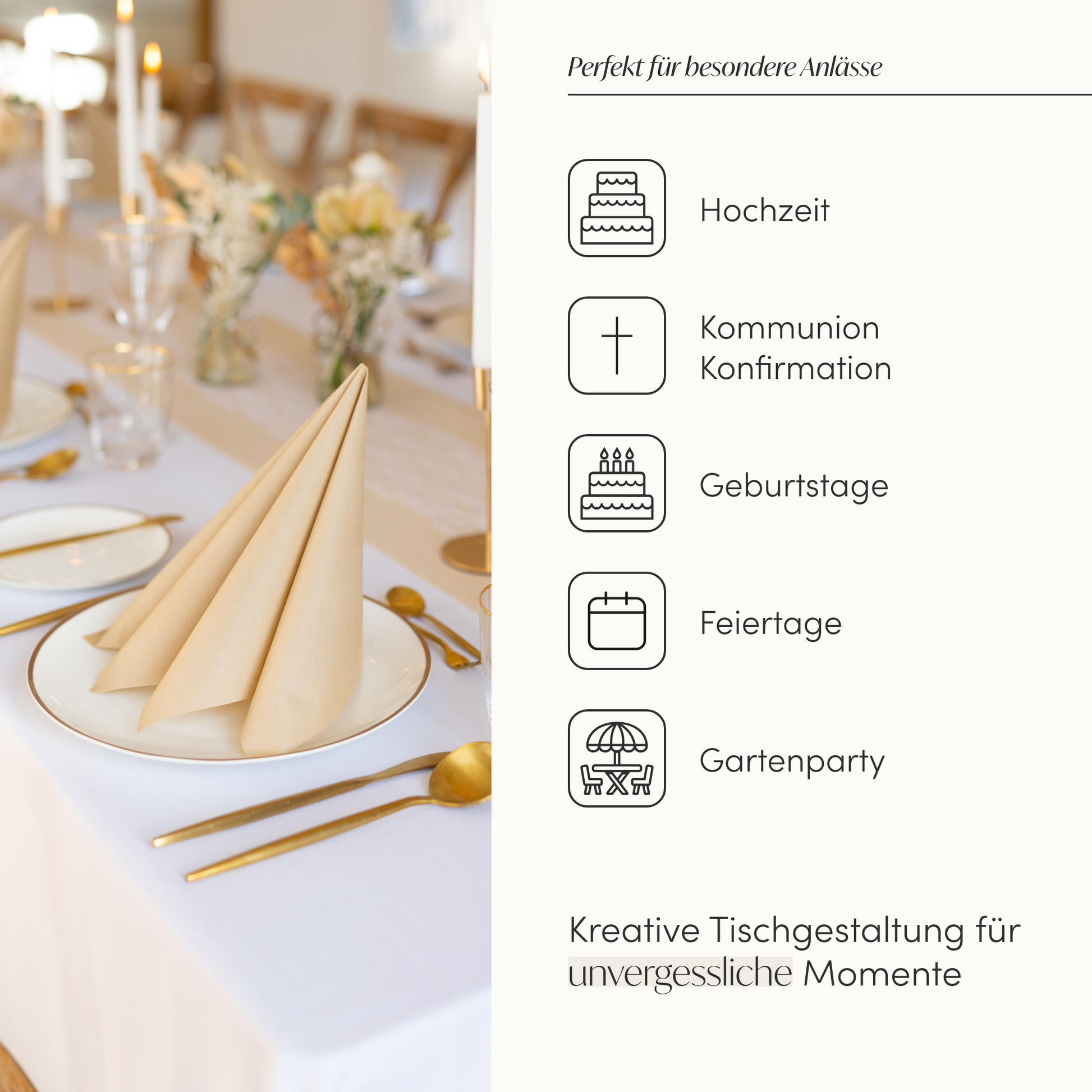 Egal ob Hochzeit, Taufe, runder Geburtstag oder ein stilvolles Dinner zu Hause: Unsere Airlaid Servietten sind die perfekte Wahl für alle, die Wert auf eine erstklassige Tischdekoration legen.