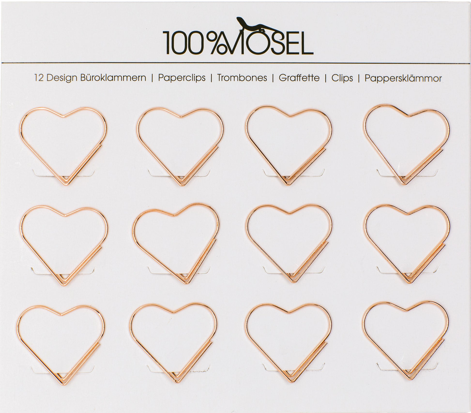 In diesem Angebot sind 12 Herzklammern enthalten, die auf einem Karton der Größe 16 x 14 cm festgesteckt sind.
