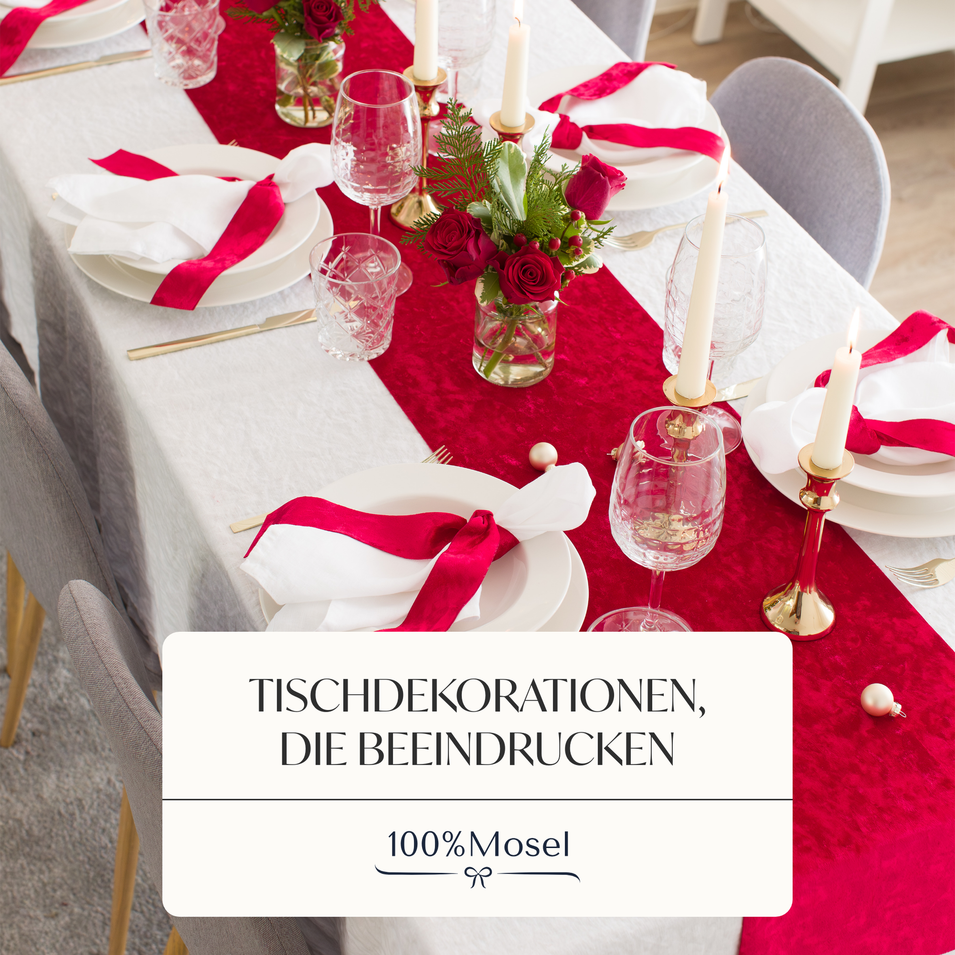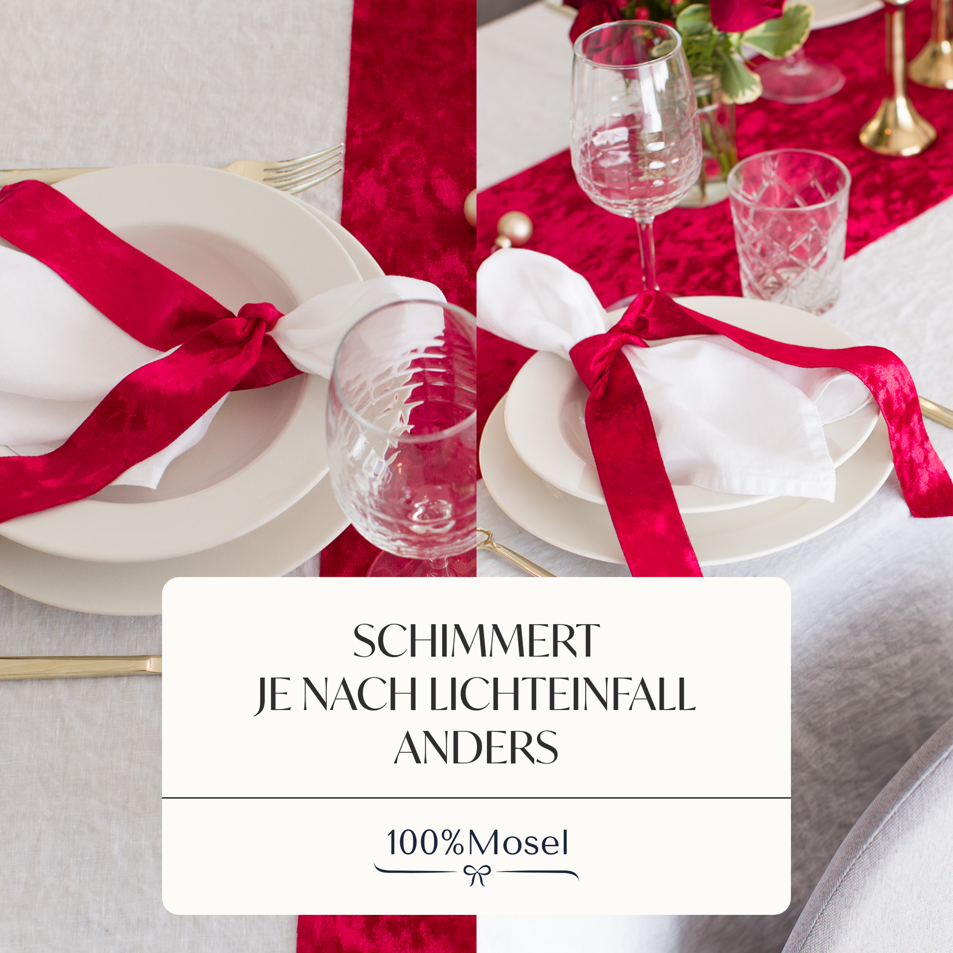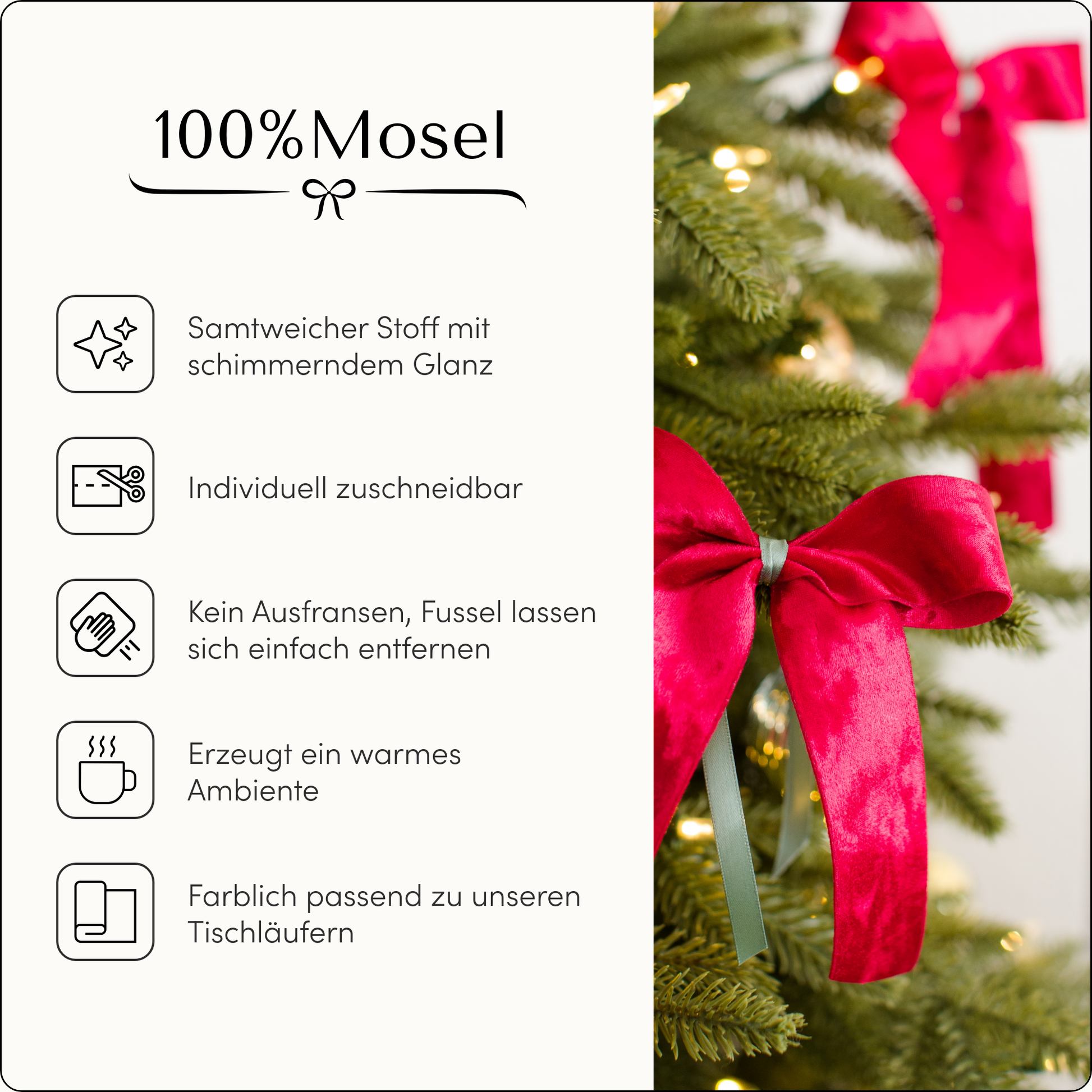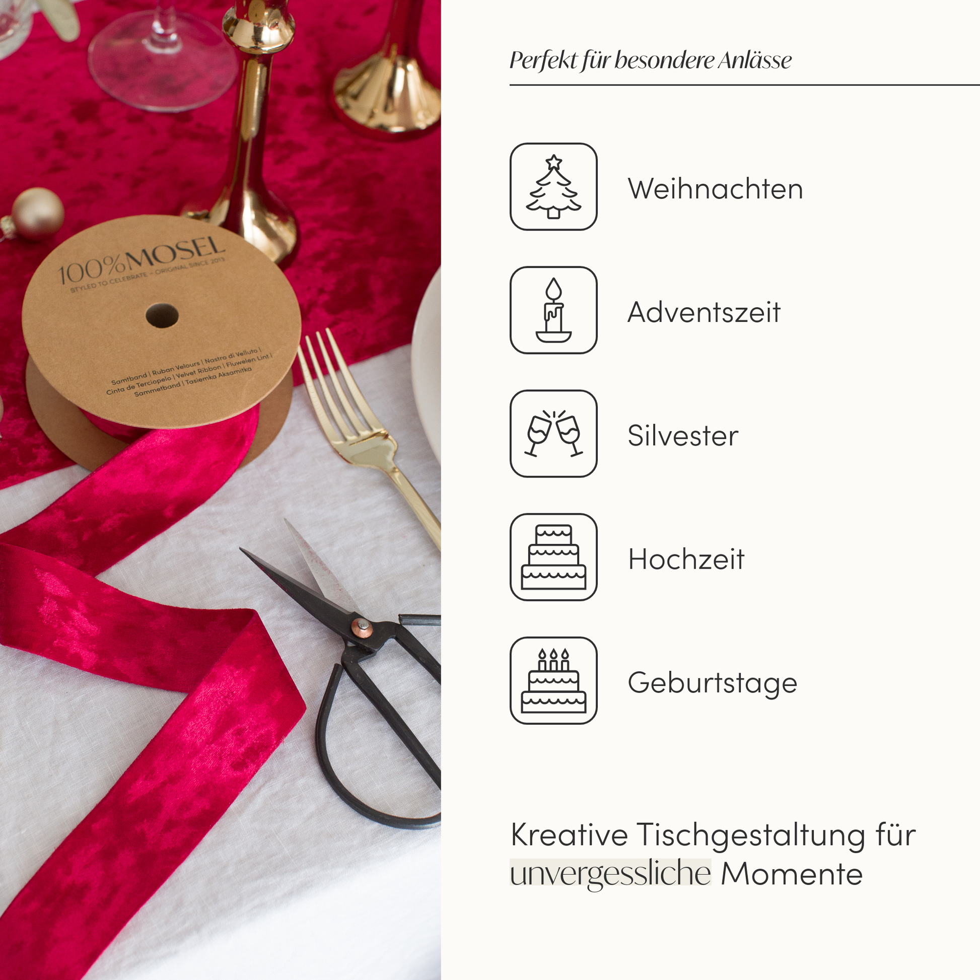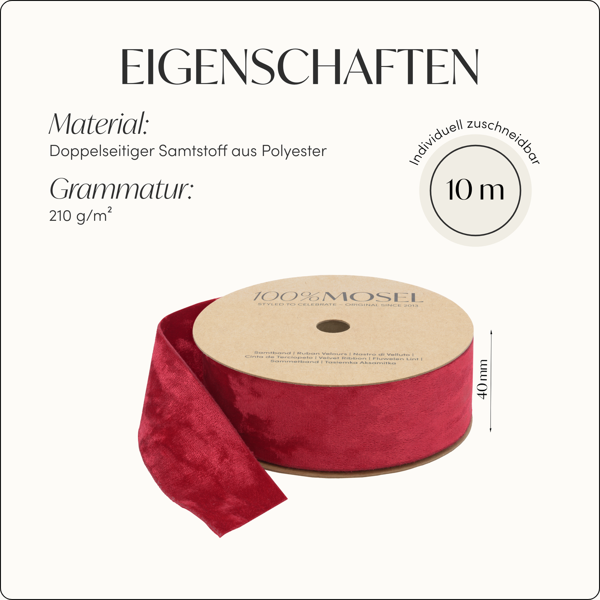 Samtig weiches Dekoband für herbstliche und weihnachtliche Tischdekorationen und Geschenkverpackungen, für Winterhochzeiten und Geburtstage. Das beidseitig samtweiche Dekoband aus glänzendem Polyestersamt verleiht deiner Tischdeko einen warmen und edlen Look und sorgt für ein besonderes Ambiente. Das Schleifenband vereint klassische Pannesamtoptik und weihnachtliche Farben. Durch den schimmernden Glanz wirkt das Band sehr edel und eignet sich für viele Dekoideen. Durch die doppelseitige Samtoptik ist das Band perfekt zum Binden von besonderen Schleifen.