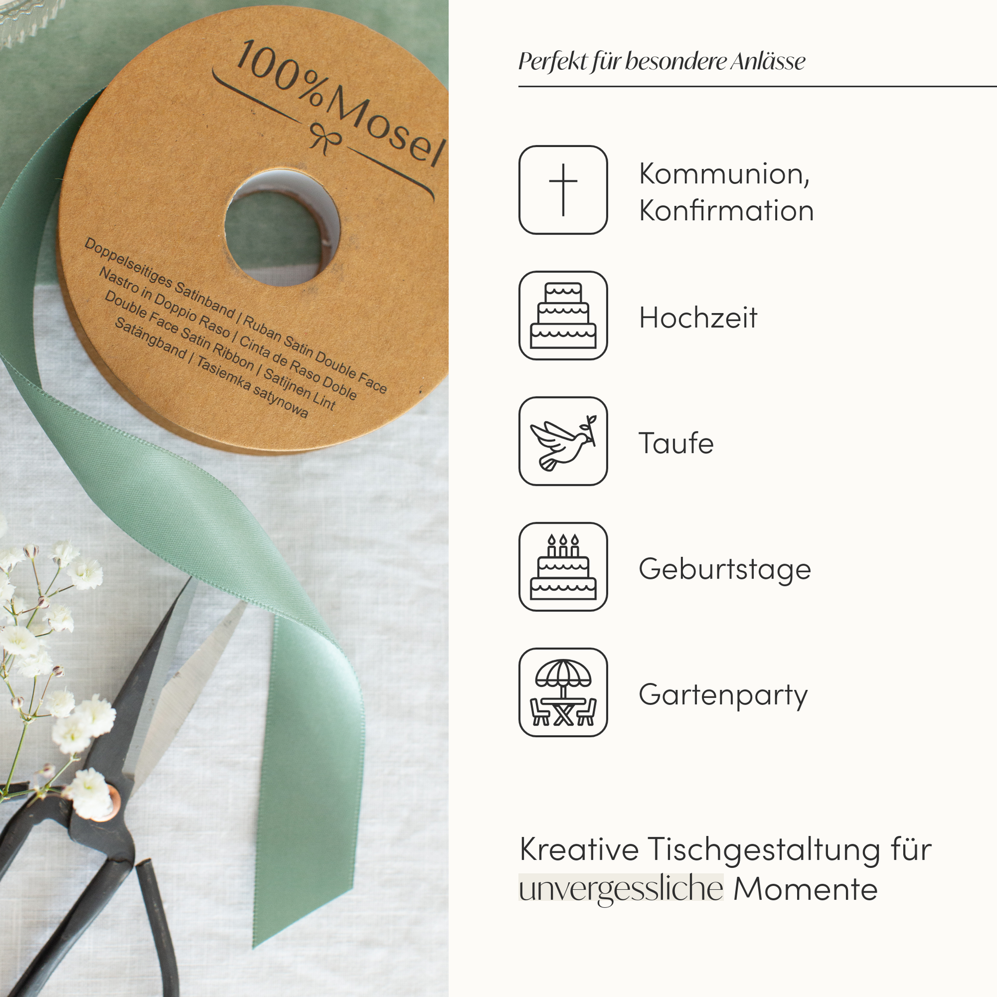 Verpacke Geschenke und gestalte Dekorationen zu Hochzeit, Kommunion, Konfirmation, Jugendweihe, Taufe, Geburtstagen und anderen Festlichkeiten: Unser hochwertig verarbeitetes Satinband lässt sich zum Einpacken von Geschenken nutzen, zum Aufhängen von Dekoelementen, zum Binden von Schleifen für die Blumendeko in Kirche und Festlocation oder auch zum Gestalten von Türkränzen oder Blumenarrangements zu Hause.