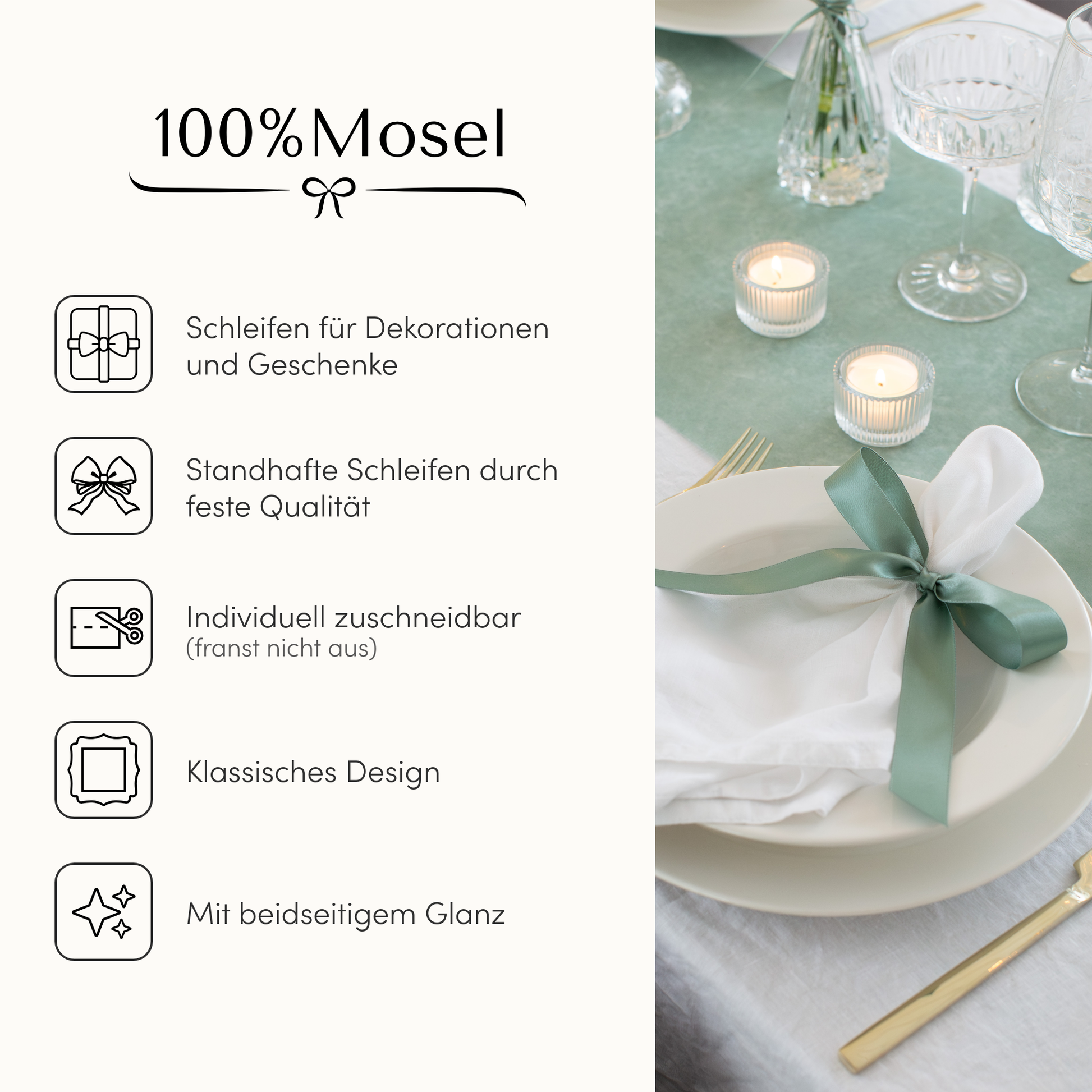Die dicht gewebten 100%Mosel Satinbänder sind besonders fest und haben eine hohe Stabilität, so dass einmal gebundene Schleifen schön in Form bleiben, ganz ohne Drahtkante. Kombiniere verschiedene Breiten, um besonders wirkungsvolle Effekte zu erzielen!