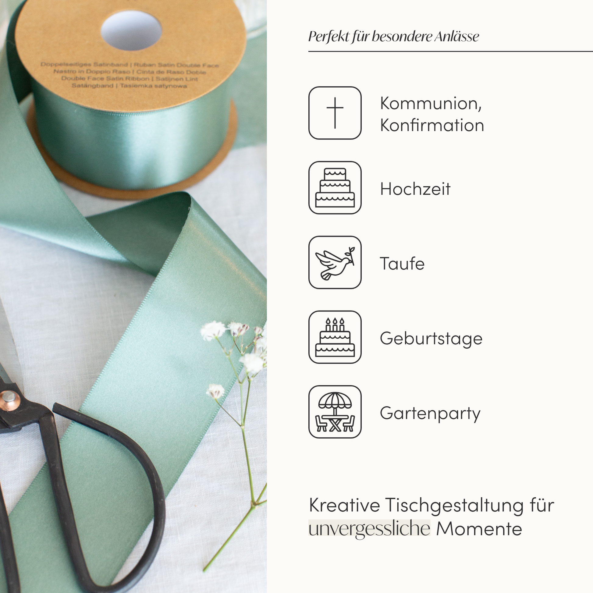 Verpacke Geschenke und gestalte Dekorationen zu Hochzeit, Kommunion, Konfirmation, Jugendweihe, Taufe, Geburtstagen und anderen Festlichkeiten: Unser hochwertig verarbeitetes Satinband lässt sich zum Einpacken von Geschenken nutzen, zum Aufhängen von Dekoelementen, zum Binden von Schleifen für die Blumendeko in Kirche und Festlocation oder auch zum Gestalten von Türkränzen oder Blumenarrangements zu Hause.