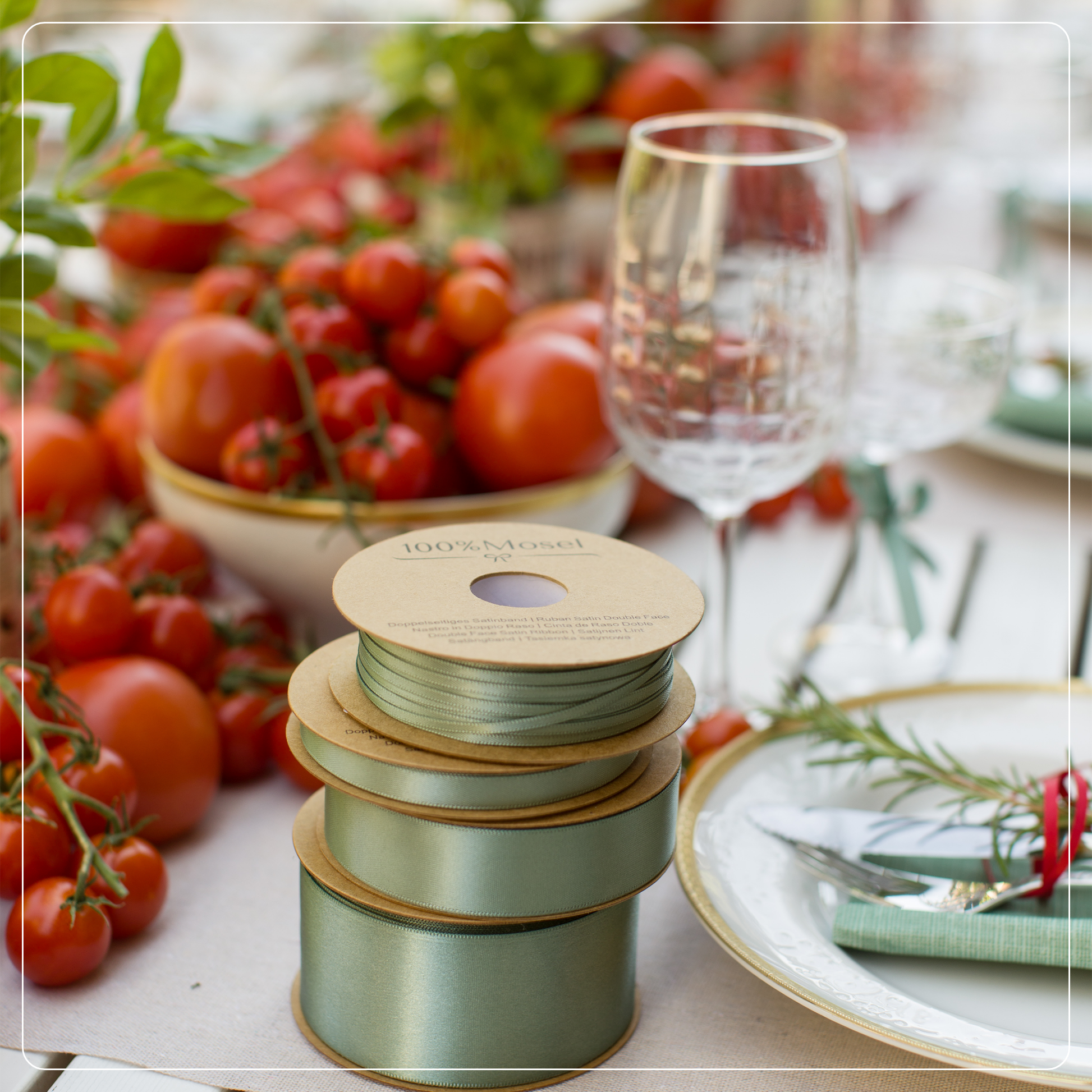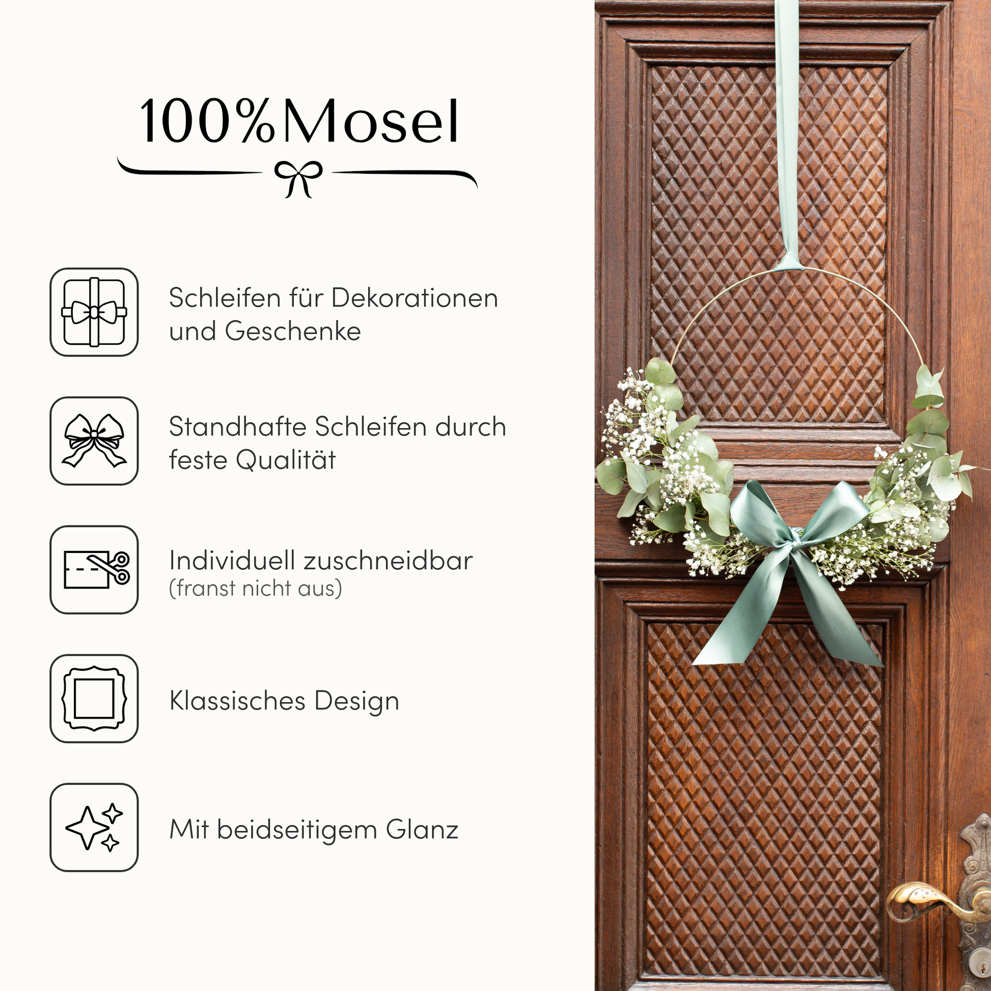 Die dicht gewebten 100%Mosel Satinbänder sind besonders fest und haben eine hohe Stabilität, so dass einmal gebundene Schleifen schön in Form bleiben, ganz ohne Drahtkante. Kombiniere verschiedene Breiten, um besonders wirkungsvolle Effekte zu erzielen!