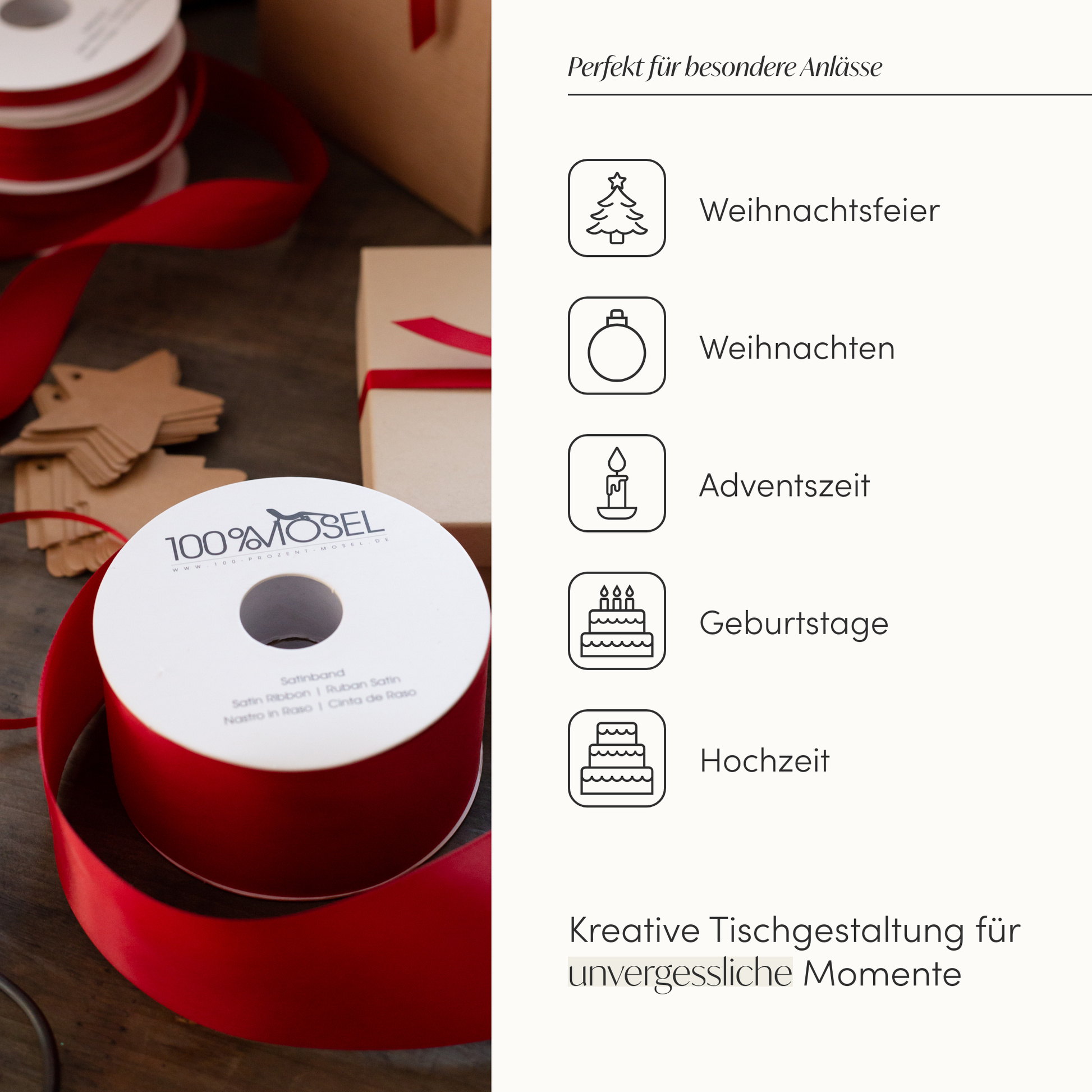 Hochwertig verarbeitetes Doppelsatinband für Weihnachtsgeschenke, Tischdekoration und andere Dekoprojekte. Die feine Oberfläche hat einen matten Glanz, der besonders edel wirkt. Die schönen Bänder lassen sich als Geschenkschleife nutzen, sind aber auch als Dekoration für Adventskalender, Türkränze, Gestecke oder als Dekorationsband ein Hingucker. Mit dem schlichten und klassischen Dekoband entstehen effektvolle Verpackungen, die dazu noch nachhaltig sind. Das Satinband kann viele Male wiederverwendet werden und wird den Beschenkten noch lange Freude bereiten.
