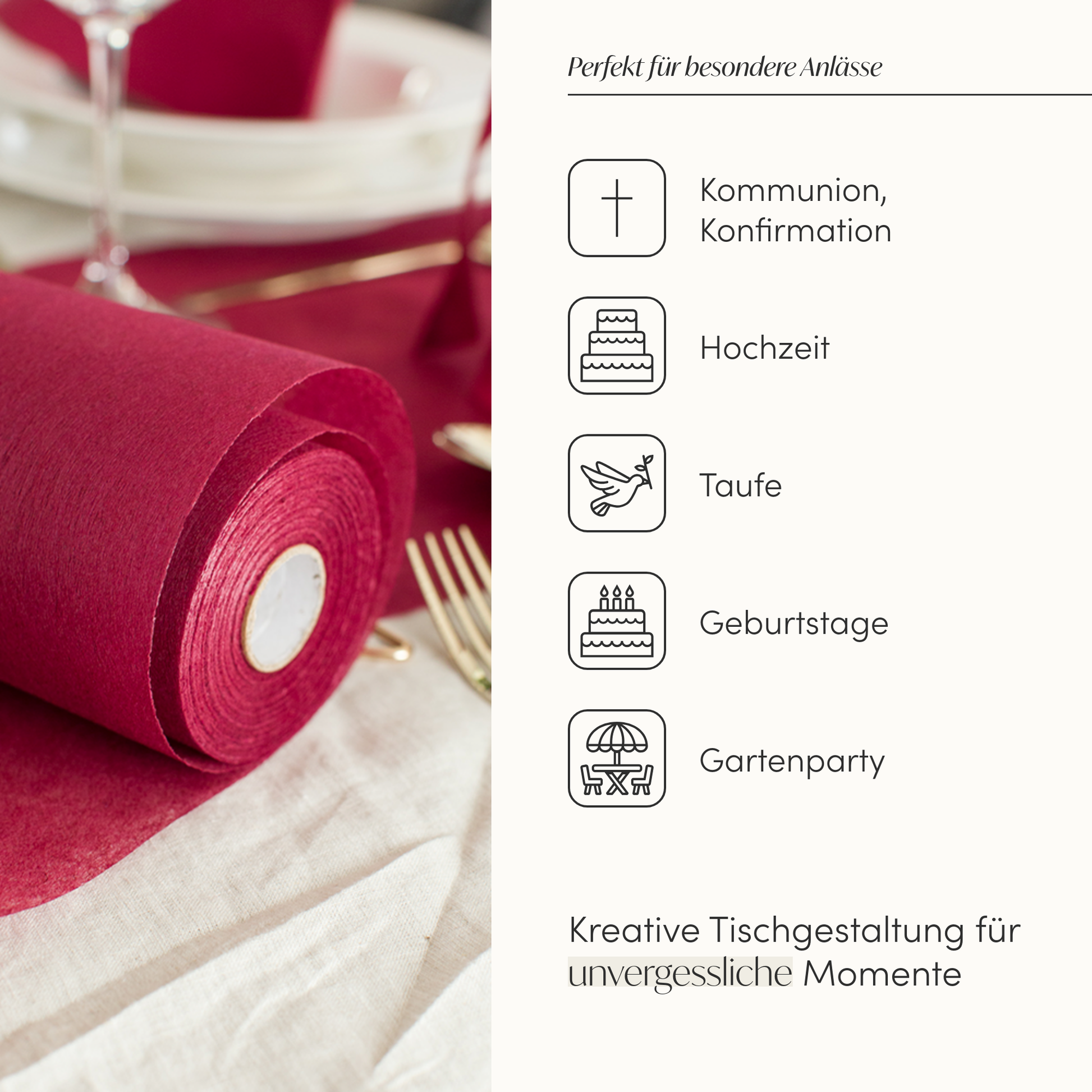 Unser Vlies Tischläufer in strahlendem Bordeauxrot verleiht deinen festlichen Anlässen eine erfrischende Eleganz. Der halbtransparente Einwegtischläufer ist die perfekte Basis, um mit deiner DIY Tischdeko unvergessliche Momente zu kreieren.