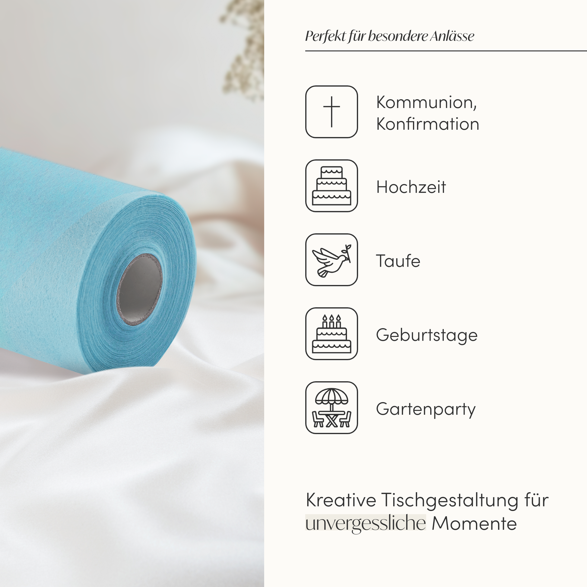 Unser Vlies Tischläufer in strahlendem Himmelblau verleiht deinen festlichen Anlässen eine erfrischende Eleganz. Der halbtransparente Einwegtischläufer ist die perfekte Basis, um mit deiner DIY Tischdeko unvergessliche Momente zu kreieren.