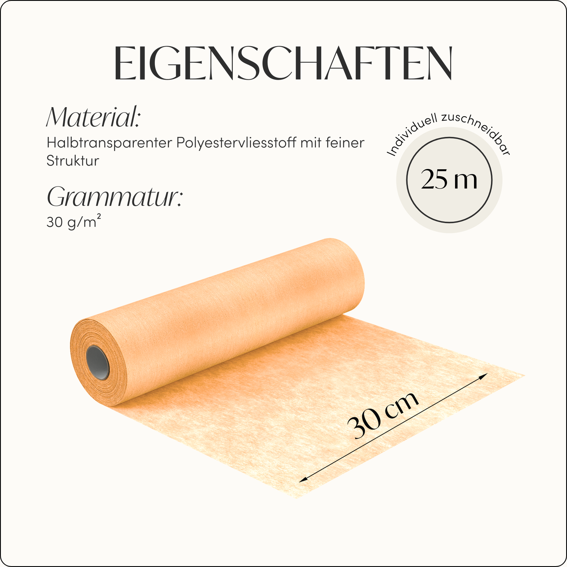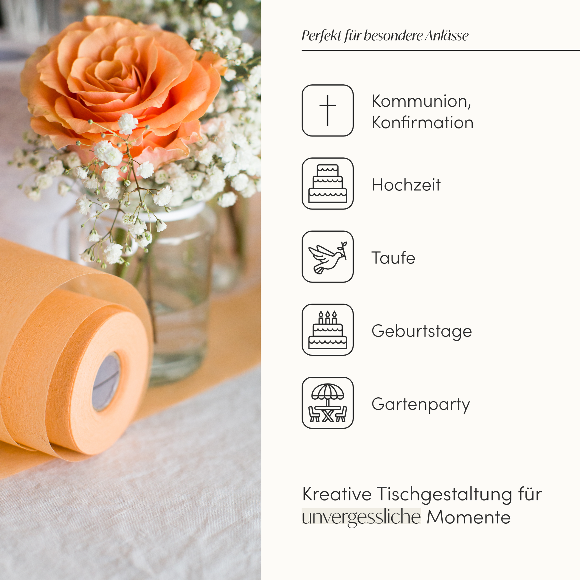 Unser Vlies Tischläufer im frischen Farbton Peach Apricot verleiht deinen festlichen Anlässen eine zarte Eleganz. Der halbtransparente Einwegtischläufer ist die perfekte Basis, um mit deiner DIY Tischdeko unvergessliche Momente zu kreieren.Egal, ob du eine Babyparty, Hochzeitsfeier, Geburtstag oder ein elegantes Dinner planst - unser Tischläufer verwandelt jeden Tisch in einen Hingucker. Mit seiner Grammatur von 30 g/m² ist der Läufer leicht und dennoch strapazierfähig. Das Tischband ist individuell zuschneidbar und passt sich so perfekt an die Größe deiner Tische an. Mit einer Breite von 30 cm und einer Länge von 25 Metern reicht die Rolle für eine größere oder mehrere kleine Festivitäten.Als einer unserer Bestseller bietet der Tischläufer aus hochwertigem Polyestervlies zahlreiche Vorteile:- Keine Wellenbildung: Der Läufer liegt flach und faltenfrei auf dem Tisch.- Reißfestigkeit: Trotz seiner Zartheit ist der Läufer erstaunlich robust und reißfest.- Wasserfest & abwischbar: Ein Regenschauer vor der Gartenparty ist kein Problem.- Anti-Kranz-Bildung: Keine unansehnlichen Glasabdrücke mehr.- Wiederverwendbar: Nach der Veranstaltung kann der Läufer aufgerollt und für zukünftige Anlässe aufbewahrt werden.Entdecke unzählige kreative Möglichkeiten:- Tischdekoration: Verwende ihn allein oder in Kombination mit einer Tischdecke.- Bastelprojekte: Kreiere Girlanden, Papierblumen, Geschenkverpackungen und mehr.- Raumdekoration: Hänge unschöne Decken ab oder nutze den Tischläufer als Hintergrund.