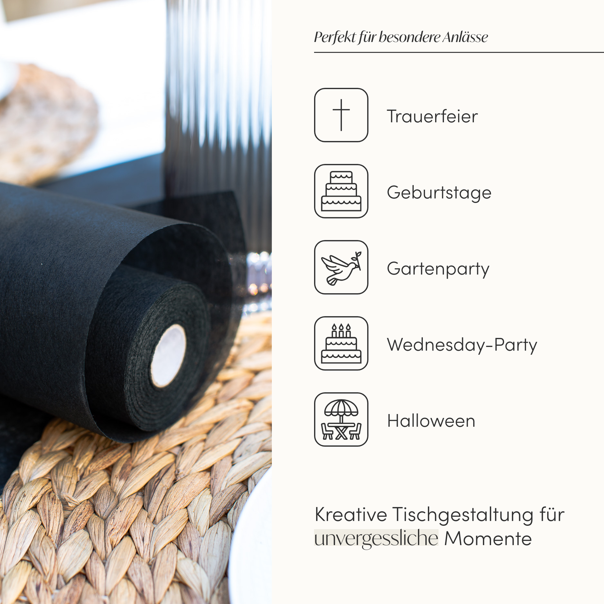 Unser Vlies Tischläufer in strahlendem Schwarz verleiht deinen festlichen Anlässen eine erfrischende Eleganz. Der halbtransparente Einwegtischläufer ist die perfekte Basis, um mit deiner DIY Tischdeko unvergessliche Momente zu kreieren.