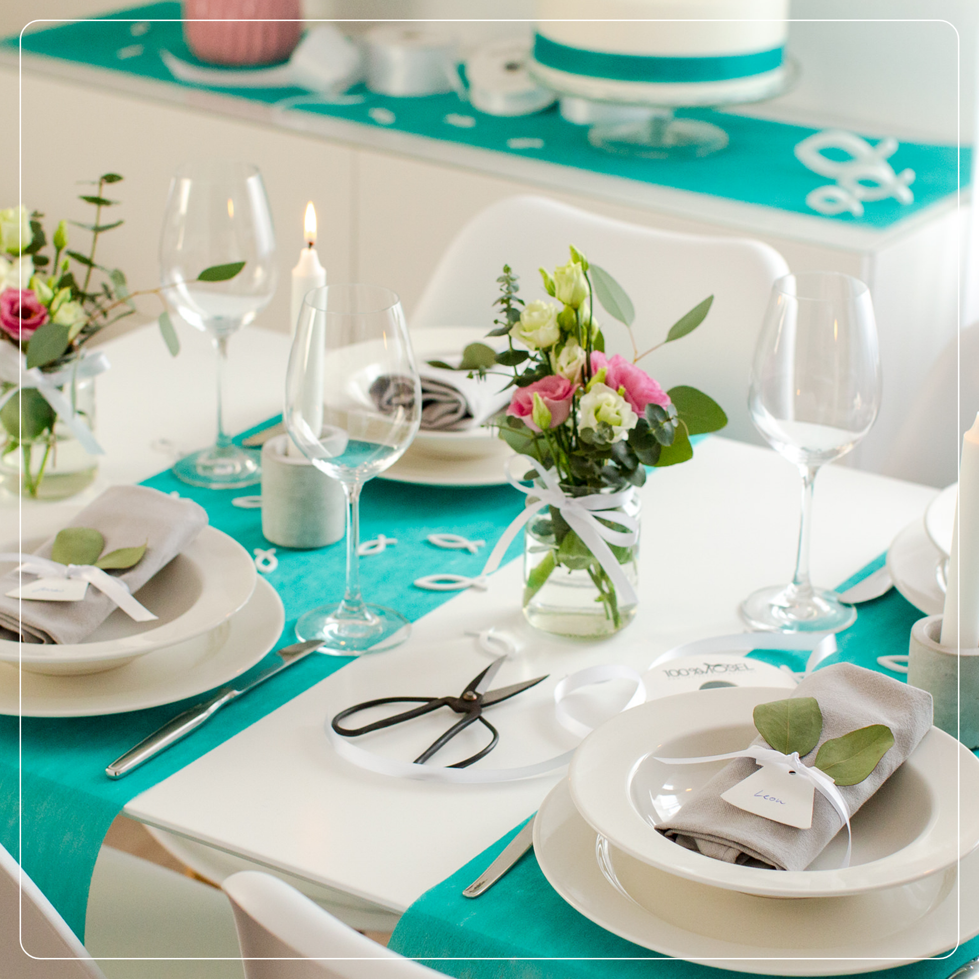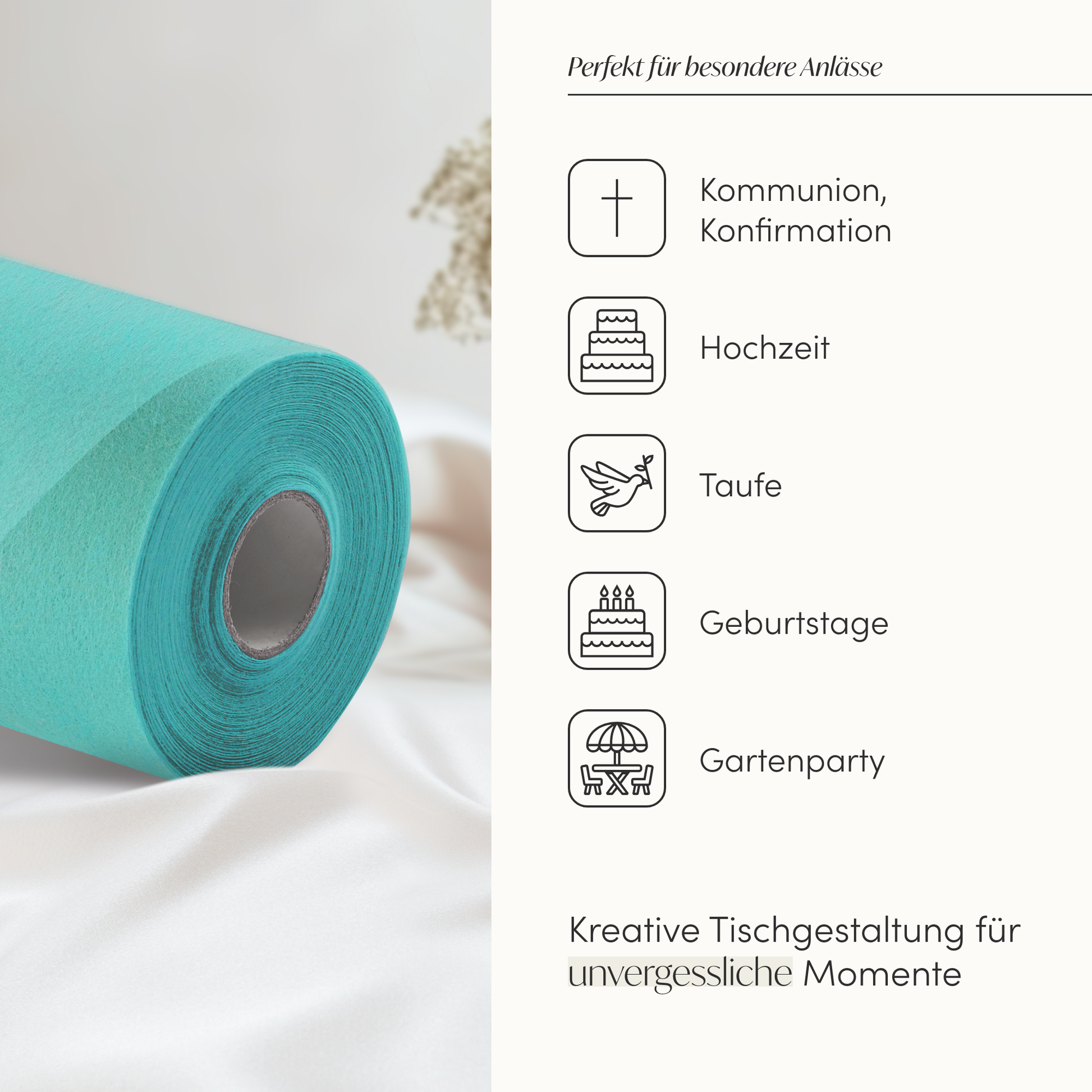 Unser Vlies Tischläufer in strahlendem Türkis verleiht deinen festlichen Anlässen eine erfrischende Eleganz. Der halbtransparente Einwegtischläufer ist die perfekte Basis, um mit deiner DIY Tischdeko unvergessliche Momente zu kreieren.