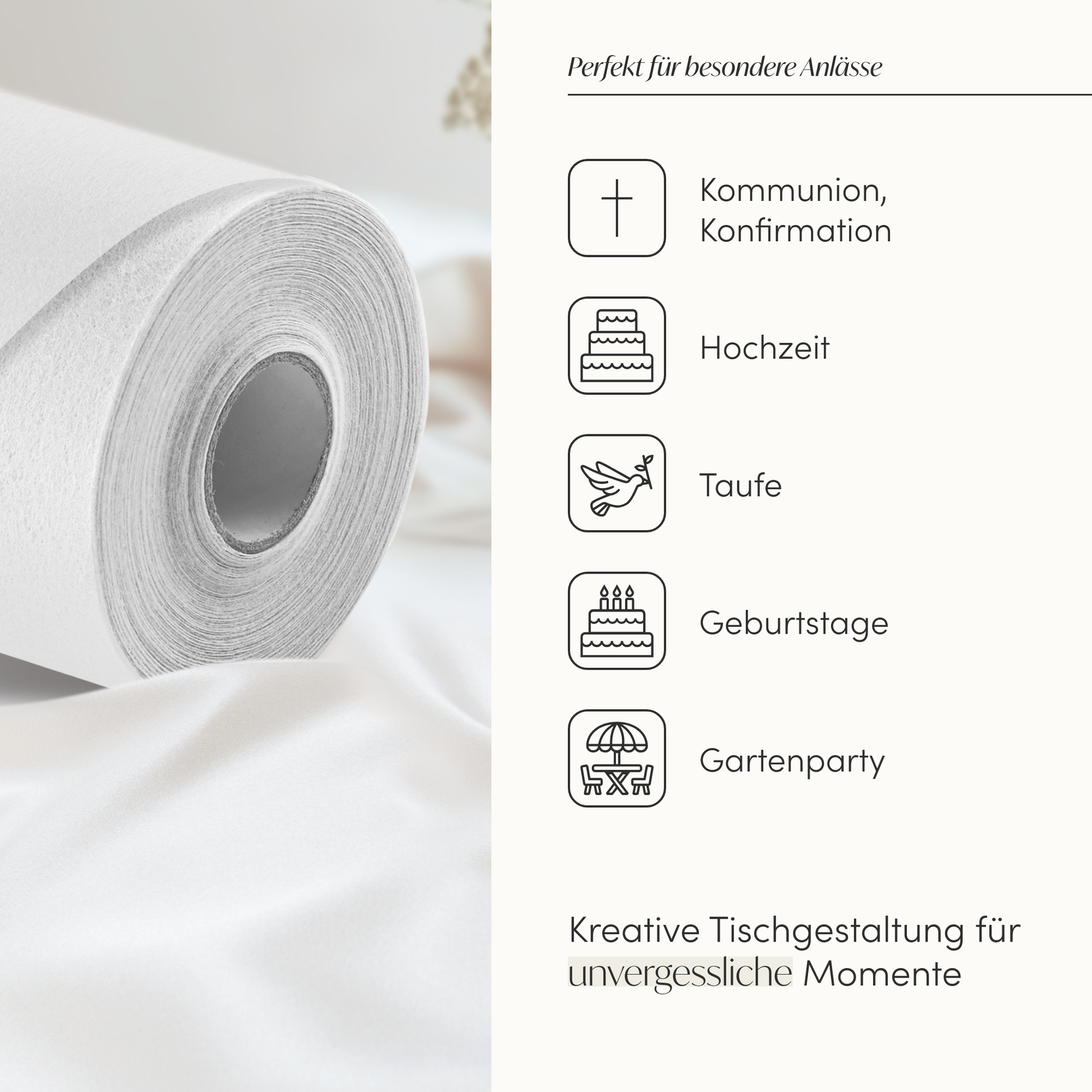 Unser Vlies Tischläufer in strahlendem Weiß verleiht deinen festlichen Anlässen eine erfrischende Eleganz. Der halbtransparente Einwegtischläufer ist die perfekte Basis, um mit deiner DIY Tischdeko unvergessliche Momente zu kreieren.